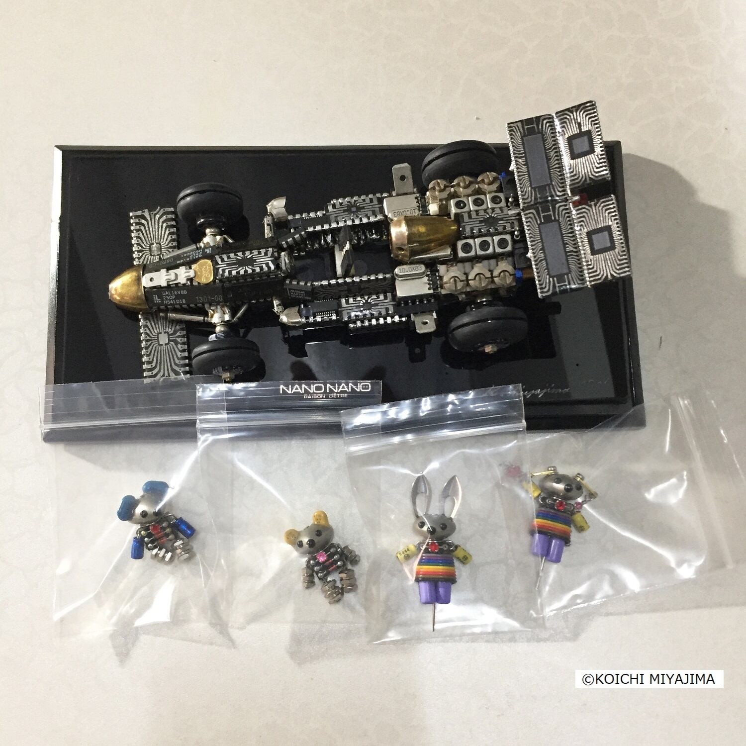 車の長さは約13cm、いろいろな電子部品を加工し、NANONANO作家本人が製作しています。制作時の部材や気持ちにより、ひとつひとつ異なりますから『世界に一つだけの作品』になります。作品は進化しているため長さなどその都度変化します。専用アクリルケースにはサインを彫ります。2体コンパニオンとドライバーのM-801、助手席には801の黄色い耳の子が付きます。NANONANOは乗物が好きです。M-801はスピード狂です。
