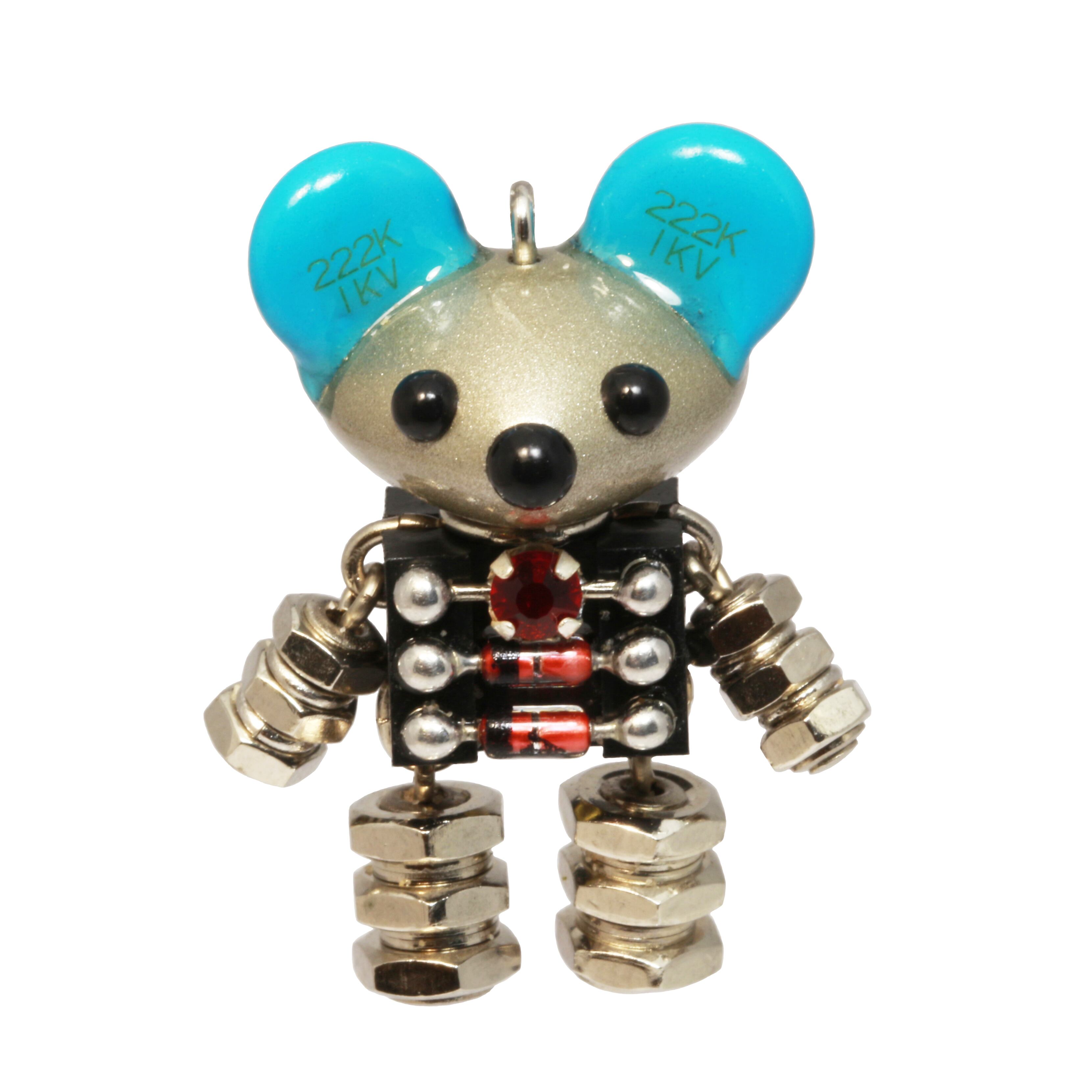 6ピンI Cスタンドを2個張り合わせた胴体に、青いクリスタルとダイオードを無鉛ハンダ付け。頭部に差し込んだ青いバリスターの耳が特徴的。腕と脚は六角ナットを使用。