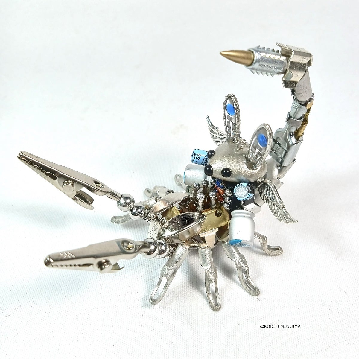 全長約8cm、高さ6cm、 電気配線用の圧着端子、圧着スリーブなどでNANONANO作家本人が制作しています。腕はメモクリップになります。制作時の部材により、ひとつひとつ異なります。キャラクター(M-808aoiエンジェル)が付いています。サイン入り、